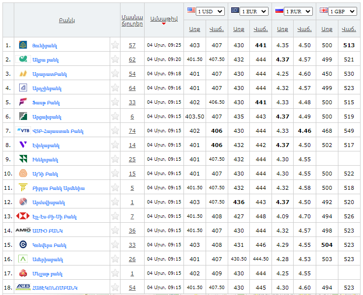 Ներկայացնում ենք Հայաստանի բանկերի կողմից գնվող և վաճառվող արտարժույթների փոխարժեքները մարտի 4-ի դրությամբ՝ ըստ rate.am-ի: