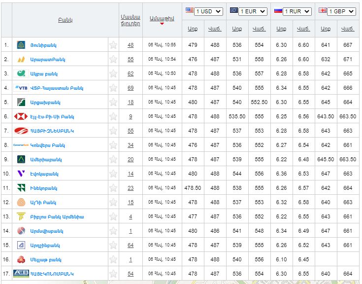 Ներկայացնում ենք Հայաստանի բանկերի կողմից գնվող և վաճառվող արտարժույթների փոխարժեքները հունվարի 6-ի դրությամբ՝ ըստ rate.am-ի: