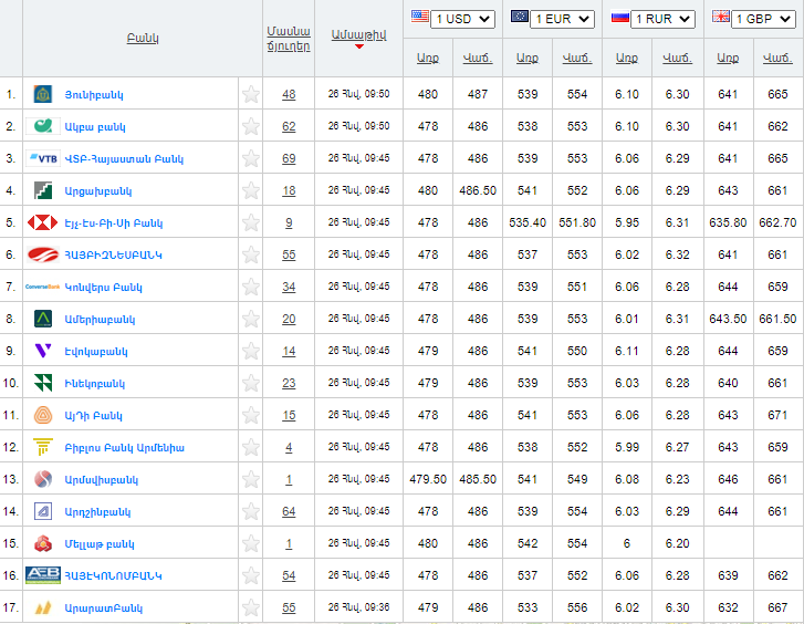 Ներկայացնում ենք Հայաստանի բանկերի կողմից գնվող և վաճառվող արտարժույթների փոխարժեքները հունվարի 26-ի դրությամբ՝ ըստ rate.am-ի: