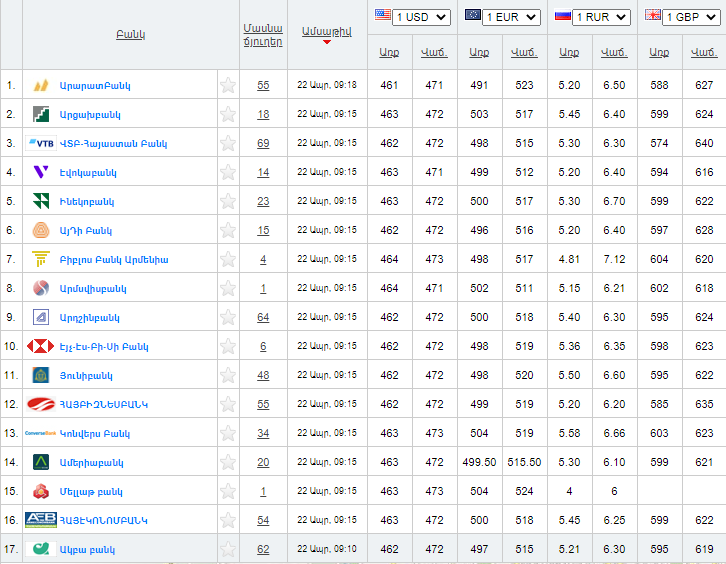 Ներկայացնում ենք Հայաստանի բանկերի կողմից գնվող և վաճառվող արտարժույթների փոխարժեքները ապրիլի 22-ի դրությամբ՝ ըստ rate.am-ի:
