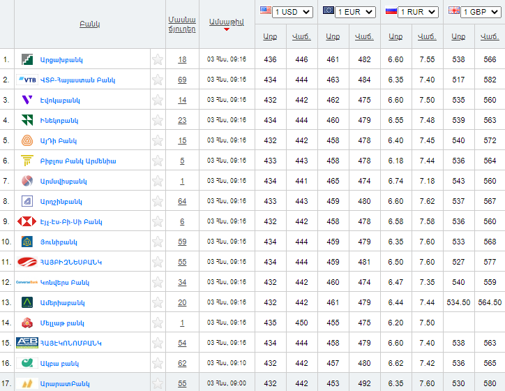 Ներկայացնում ենք Հայաստանի բանկերի կողմից գնվող և վաճառվող արտարժույթների փոխարժեքները հունիսի 3-ի դրությամբ՝ ըստ rate.am-ի: