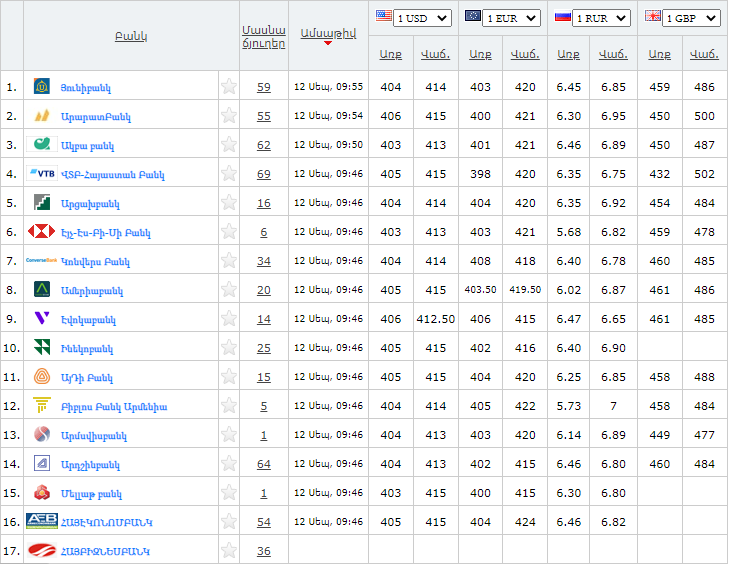 Ներկայացնում ենք Հայաստանի բանկերի կողմից գնվող և վաճառվող արտարժույթների փոխարժեքները սեպտեմբերի 10-ի դրությամբ՝ ըստ rate.am-ի: