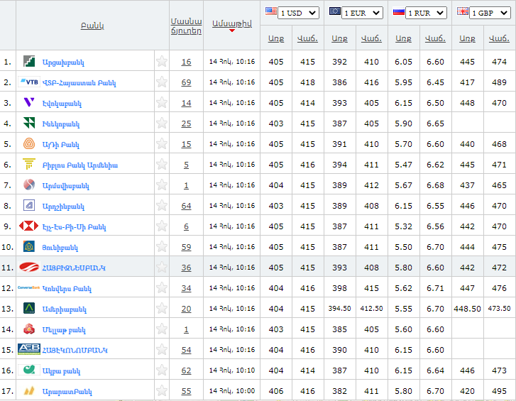 Ներկայացնում ենք Հայաստանի բանկերի կողմից գնվող և վաճառվող արտարժույթների փոխարժեքները հոկտեմբերի 11-ի դրությամբ՝ ըստ rate.am-ի: