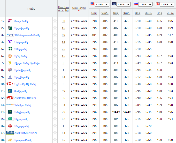 Ներկայացնում ենք Հայաստանի բանկերի կողմից գնվող և վաճառվող արտարժույթների փոխարժեքները դեկտեմբերի 7-ի դրությամբ՝ ըստ rate.am-ի: