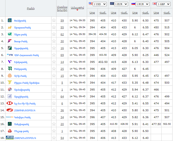 Ներկայացնում ենք Հայաստանի բանկերի կողմից գնվող և վաճառվող արտարժույթների փոխարժեքները դեկտեմբերի 14-ի դրությամբ՝ ըստ rate.am-ի: