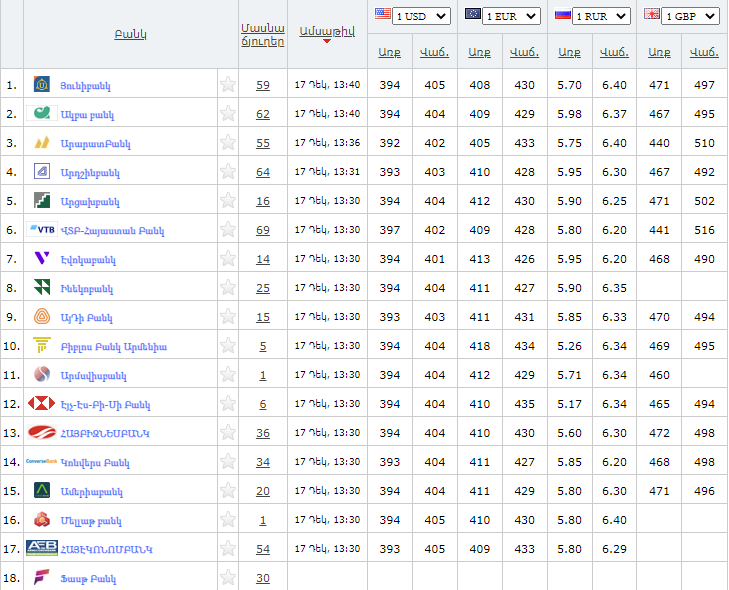 Ներկայացնում ենք Հայաստանի բանկերի կողմից գնվող և վաճառվող արտարժույթների փոխարժեքները դեկտեմբերի 17-ի դրությամբ՝ ըստ rate.am-ի: