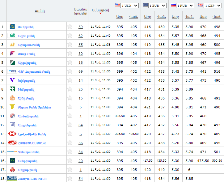 Ներկայացնում ենք Հայաստանի բանկերի կողմից գնվող և վաճառվող արտարժույթների փոխարժեքները հունվարի 11-ի դրությամբ՝ ըստ rate.am-ի: