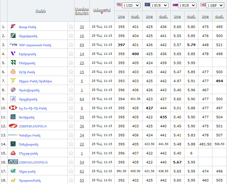 Ներկայացնում ենք Հայաստանի բանկերի կողմից գնվող և վաճառվող արտարժույթների փոխարժեքները հունվարի 25-ի դրությամբ՝ ըստ rate.am-ի: